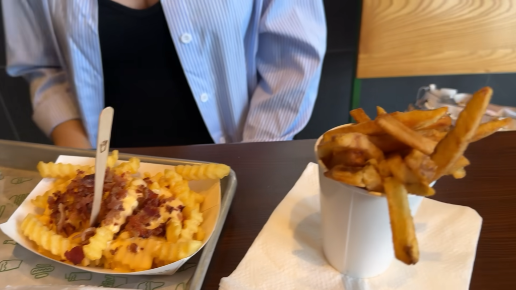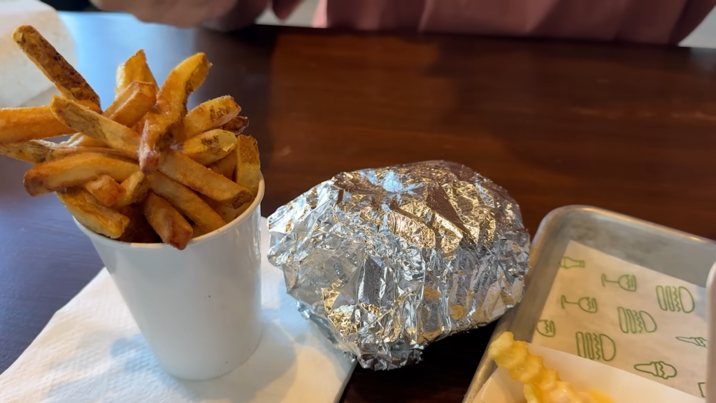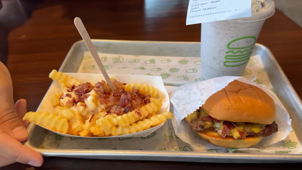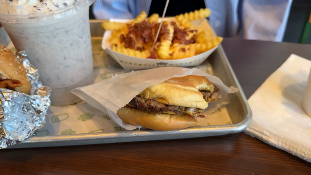 Agora, vamos falar do meu grande amor: o Shake Shack! A primeira coisa que você nota ao fazer o pedido é o visual do lugar e do menu. Tudo é muito limpo, moderno e as fotos dos lanches dão água na boca. Diferente do concorrente, o Shake Shack foca muito na qualidade visual e em ingredientes que parecem mais “gourmets”. O pão não é um pão qualquer com gergelim; é um pão de brioche amanteigado e incrivelmente macio, que abraça a carne de um jeito perfeito e não desmancha na mão.