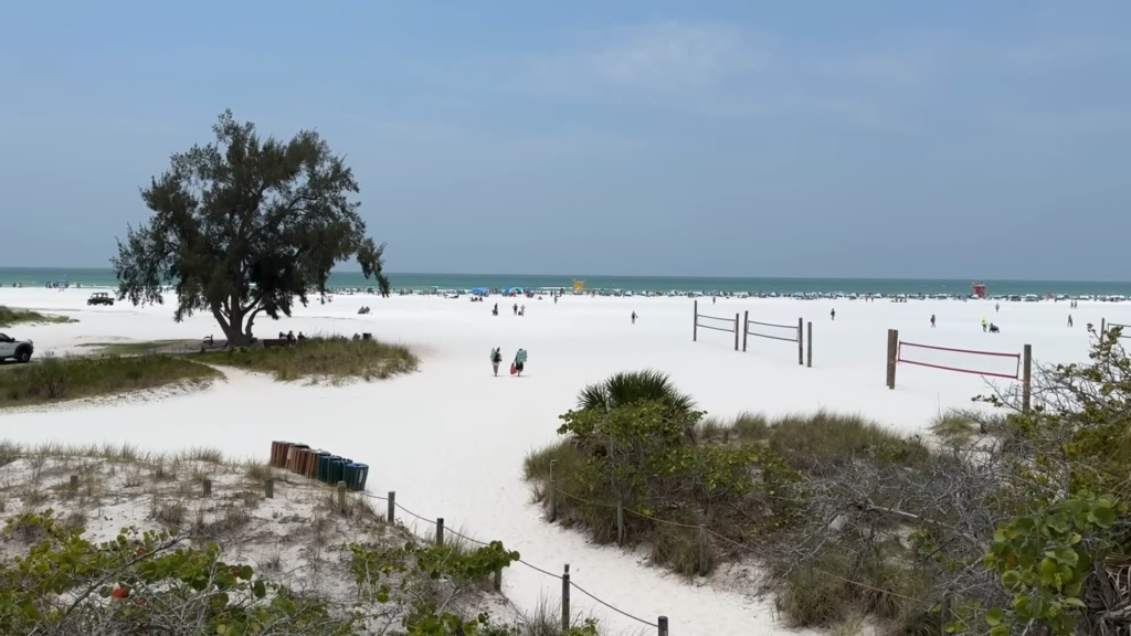 Agora, vamos falar do que interessa: o mar! A areia de Siesta Key é composta por 99% de quartzo puro. O resultado? Ela é branca como neve e, o melhor de tudo, não esquenta! Você pode caminhar descalço mesmo no sol do meio-dia que não vai queimar os pés. É uma sensação muito diferente de qualquer outra praia.