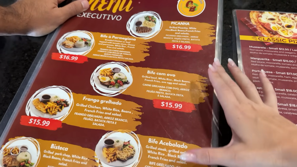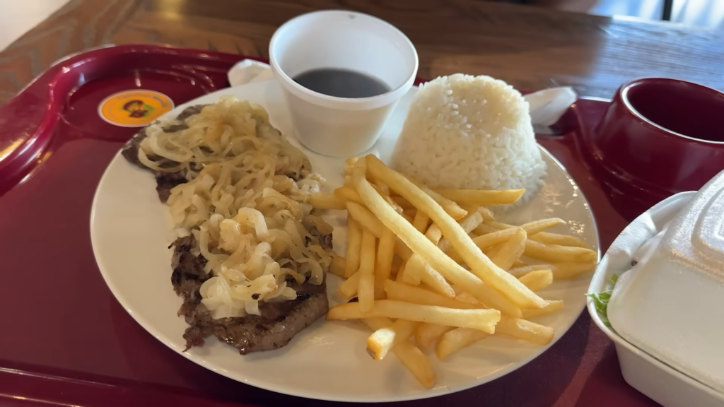 Eu confesso que fiquei muito em dúvida. Eu olho para uma picanha e meu coração bate mais forte, mas o bife acebolado piscou para mim de um jeito diferente. O Gustavo já conhece os meus gostos e cantou a bola: “Você vai amar esse de alcatra com cebola”. E ele estava certíssimo! A diferença de preço entre a picanha e a alcatra era de apenas um dólar, então você pode escolher puramente pelo seu gosto pessoal sem impactar o orçamento da viagem.
