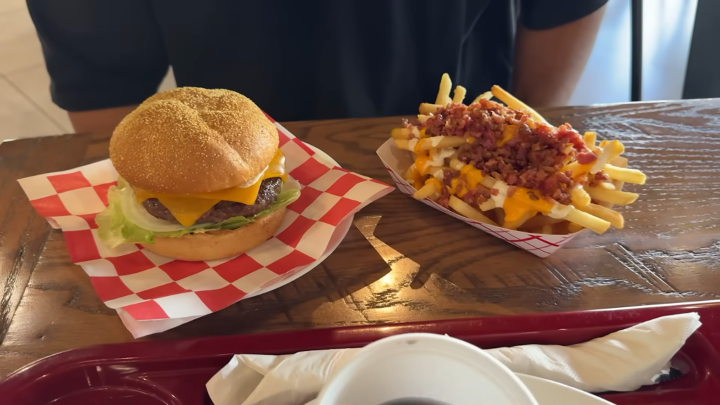 Você já parou para pensar na falta que faz uma cebola bem refogadinha quando estamos viajando? Pois é! Eu fiz o pedido do meu bife de alcatra acebolado e fiz questão de frisar: queria a carne bem passada. Isso é algo super importante aqui nos Estados Unidos. Eles costumam servir a carne bem vermelha por dentro, então se você, assim como eu, prefere a carne sem estar sangrando (ainda mais grávida!), precisa pedir “well done”. O atendente anotou tudo direitinho na nossa língua materna, o que já traz uma paz de espírito gigante.