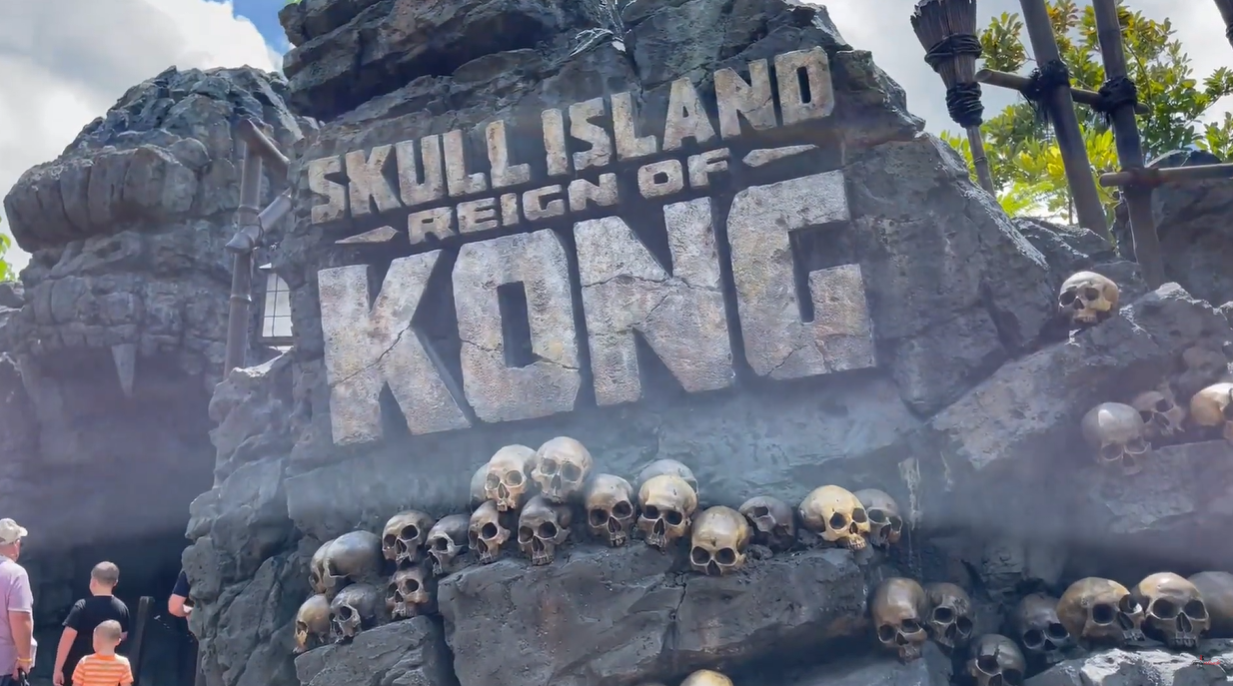 Antes de a gente entrar de cabeça no mundo dos dinos, tem uma parada obrigatória (ou quase isso) logo na fronteira com Toon Lagoon. É a área do King Kong. Vou ser sincera com você: chamar isso de “área” é um pouco de bondade da Universal. Na real, é praticamente uma atração só, um quiosque e pronto.