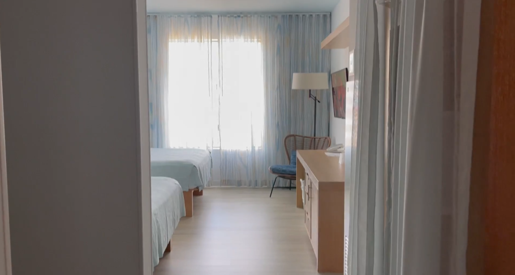 Ponto super positivo: não tem carpete! Isso é maravilhoso para quem tem alergia ou simplesmente prefere aquela sensação de chão limpo. O piso simula madeira, o que deixa o ambiente com uma cara bem moderna e higiênica. A decoração segue o estilo “surfista profissional”, com quadros de pranchas e tons de azul e areia.