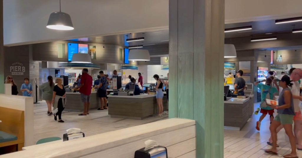 A praça de alimentação do Dockside, a Pier 8 Market, segue o estilo Quick Service. Você entra, escolhe o que quer em diferentes estações (hambúrgueres, pizzas, frango, saladas) e paga no caixa antes de sentar.